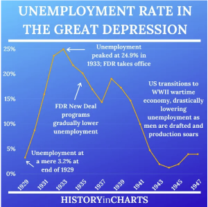 • Unemployment: During the Great Depression, U.S. unemployment hit about 25% in 1933; real GDP had fallen roughly 29% from 1929–1933. Bank failures numbered in the thousands.
