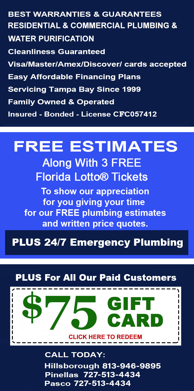 To the best of my knowledge, Cass Plumbing is the only plumber within the entire Tampa Bay area and community to show appreciation for you giving your time for our FREE in-home plumbing estimates and FREE written price estimates, by giving you something in return. AND that is 3 FREE Florida Lotto® Tickets, and then after your FREE Estimate a $75 Gift Card for our paid customers.