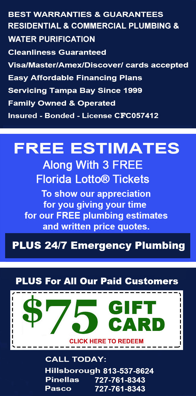 To the best of my knowledge, Cass Plumbing is the only plumber within the entire Tampa Bay area and community to show appreciation for you giving your time for our FREE in-home plumbing estimates and FREE written price estimates, by giving you something in return. AND that is 3 FREE Florida Lotto® Tickets, and then after your FREE Estimate a $75 Gift Card for our paid customers.