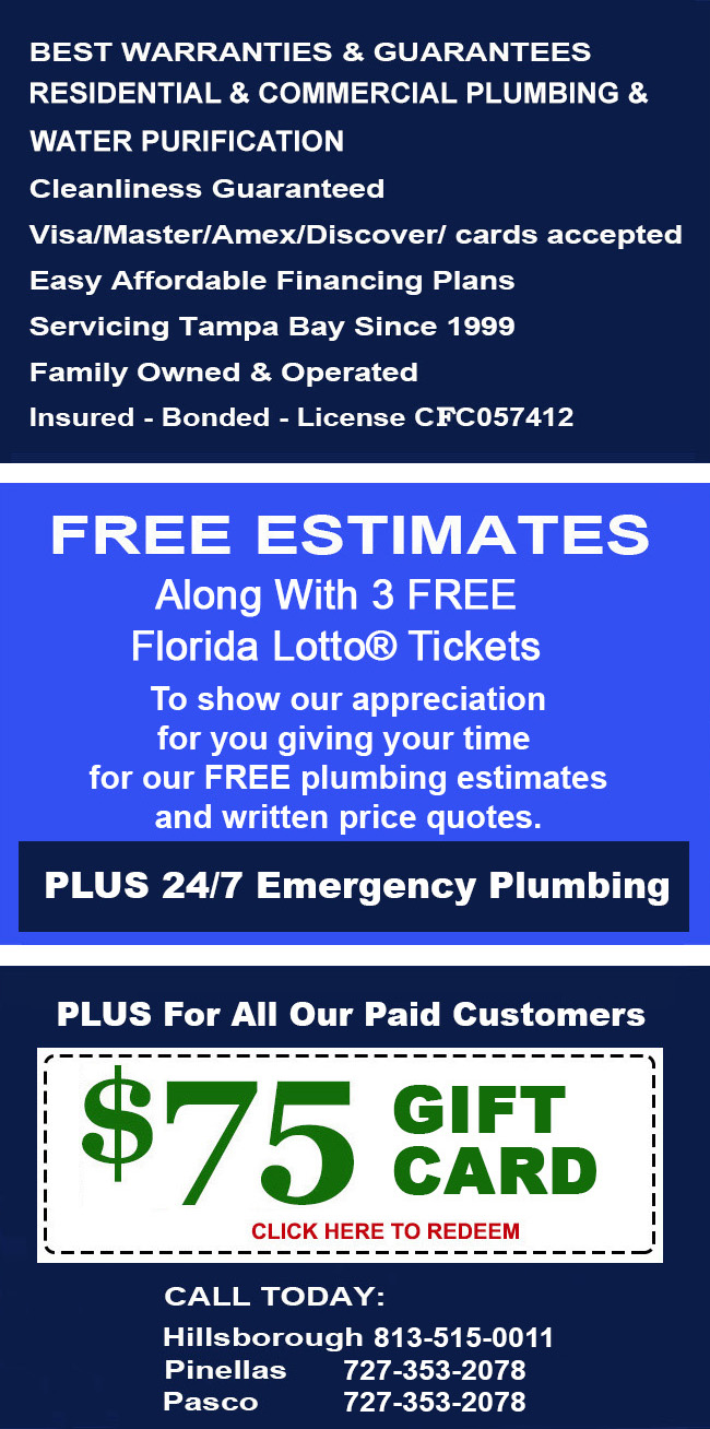 To the best of my knowledge, Cass Plumbing is the only plumber within the entire Tampa Bay area and community to show appreciation for you giving your time for our FREE in-home plumbing estimates and FREE written price estimates, by giving you something in return. AND that is 3 FREE Florida Lotto® Tickets, and then after your FREE Estimate a $75 Gift Card for our paid customers.