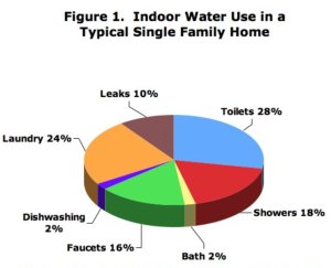 Older gravity-feed toilets use up to seven gallons of water, depending on the model. On average, flushing the toilet accounts for slightly more than 25% of the total water usage in most Tampa Bay households.